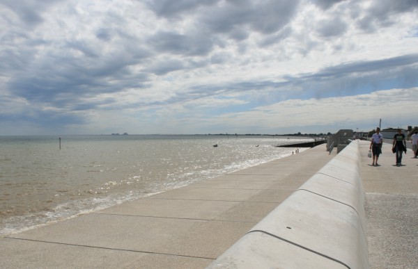 Over the last few years, work has taken place to improve the sea defences from the north end of St Mary's Bay, to Martello Tower 23 (where the A259 meets the sea wall). 2.2km of the sea wall has been replaced by a stepped concrete revetment (similar to that at St Mary's Bay). The design includes a new wave return wall, raised flood wall (approx 0.5m), improved promenade, groynes to encourage the build-up of sands, and landscaping enhancements.